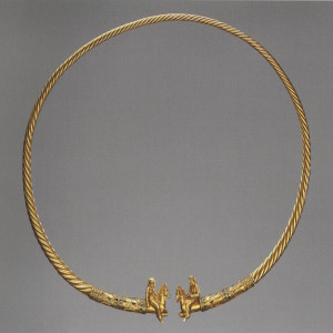 Гривна в ряду скифских шейных украшений выглядит необычной благодаря скульптурным наконечникам, выполненным в виде всадников. Подробно проработаны лица, детали одежды и конского снаряжения. Очевидно, что греческий ювелир, изготовивший гривну, ориентировался на будущего владельца, которым стал один из скифских владык.