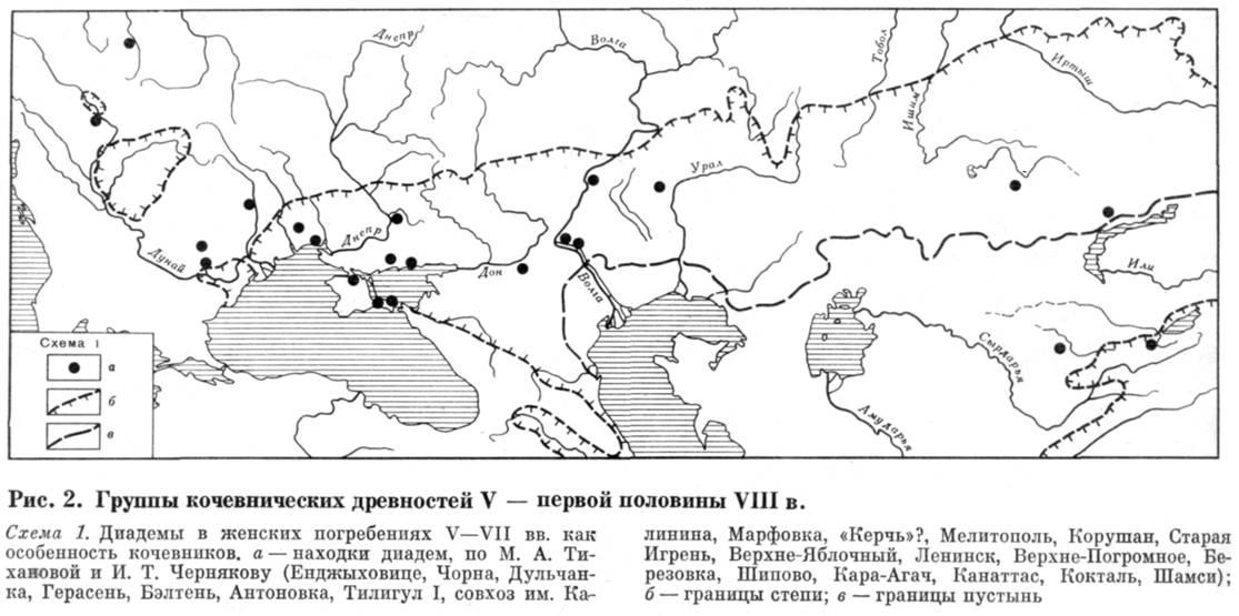 Кочевникам, несомненно, принадлежит подавляющее большинство могил в степи. О безраздельном господстве кочевников в степной зоне сообщают письменные источники. Поэтому каждое степное захоронение с конём и оружием можно уверенно считать кочевническим. Вне степи такого определённого вывода делать нельзя, так как появление оружия, сбруи, захоронений коней в могилах осёдлых народов объясняется прежде всего внутренним социальным развитием общества (возникновением дружины). Устойчивым признаком степных кочевников V-VIII вв. является отсутствие фибул, обычной находки в погребениях их осёдлых соседей, а до V в. — и степных сармат. Зато только степные женщины носили диадемы (рис. 2, схема 1) [Alföldi A., 1932, S. 59; Werner J., 1956, с. 62-68; Тиханова М.А., Черняков И.Т., 1970].