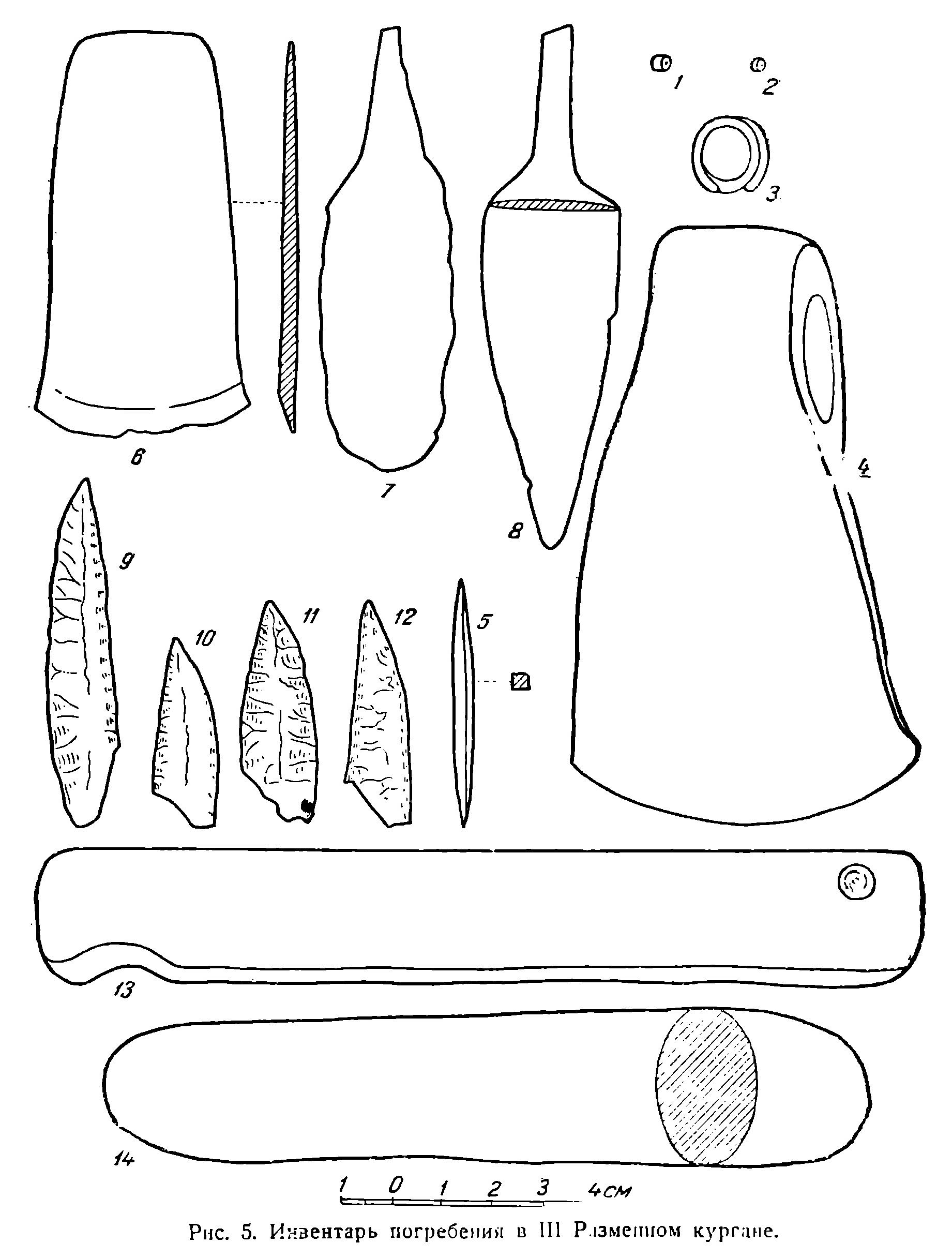 Из каменных предметов в III Разменном кургане найдены: два оселка и четыре кремнёвых наконечника стрел. Один оселок, длинный призматический с закруглённой выемкой на одной из боковых граней у нижнего конца; на противоположном конце с двух сторон незаконченные и несовпадающие центрами конические сверлины (рис. 5, 13). Длина оселка 17.4 см, ширина 2.3 см, диаметр сверлины 0.7 см. Второй оселок овального сечения, с закруглёнными концами (рис. 5, 14). Длина 15 см, ширина 3.1 см, толщина 1.9 см. Оселки нередки в больших курганах, но ещё более они характерны для скифских погребений.