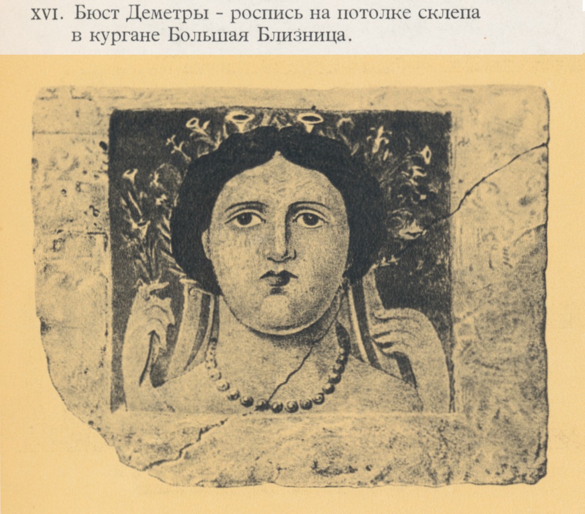 ^ XVI. Бюст Деметры — роспись на потолке склепа в кургане Большая Близница.(Открыть Рис. XVI в новом окне) |
