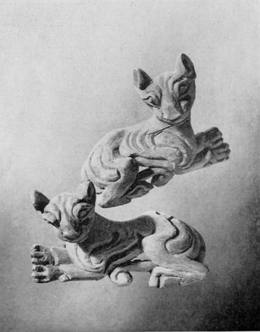 Тигры — деревянные украшения конской узды.Четвёртый Пазырыкский курган.(Открыть фото в новом окне) |