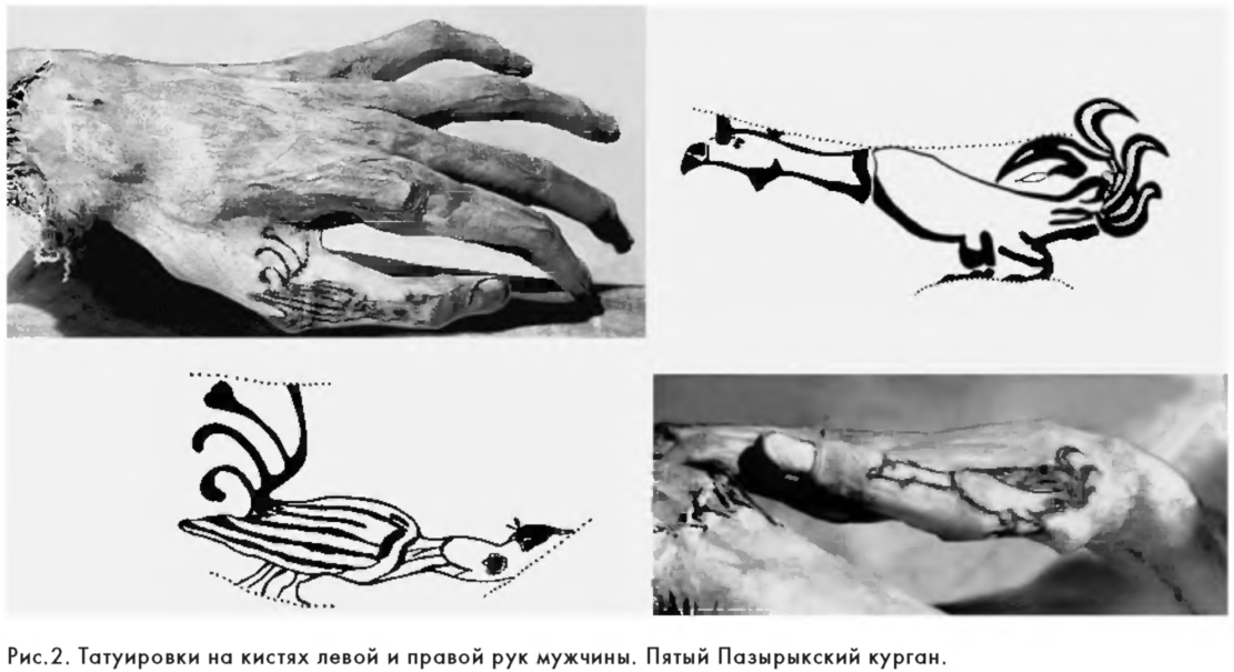 Большой интерес представляет мумифицированное тело мужчины-вождя из Второго Пазырыкского кургана. Оказалось, что обе его руки от плеч до кистей сплошь покрыты татуированными рисунками [1. С. 137]. Помимо этого, татуировка нанесена частично на грудь, спину и ноги от щиколотки до колена. Основной мотив татуировки — изображения животных: реальных и фантастических, выполненных в особой художественной манере, в так называемом зверином стиле, характерном для древнеалтайского искусства. Эта замечательная находка на протяжении многих лет оставалась единственной.