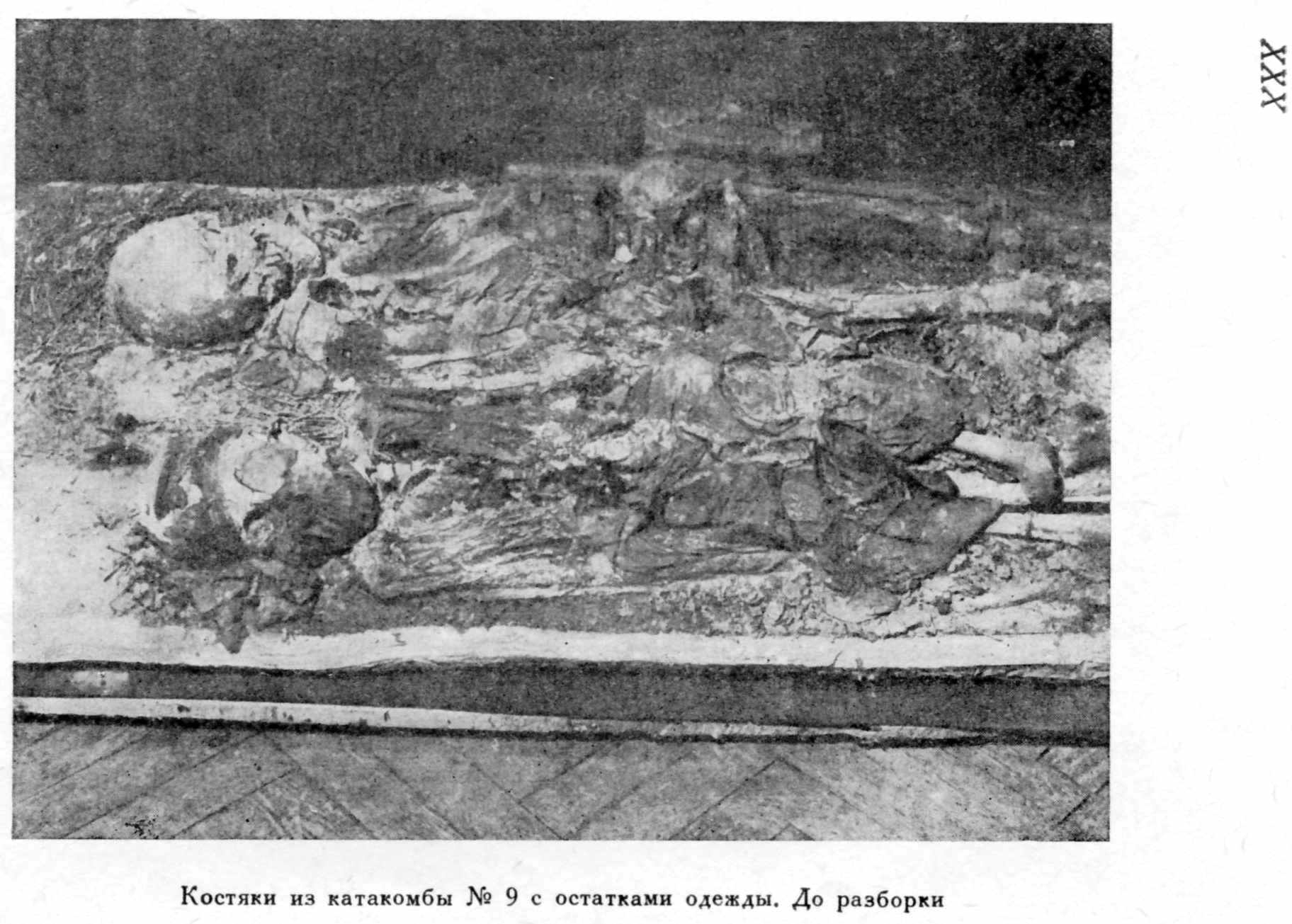 ^ XXX. Костяки из катакомбы №9 с остатками одежды. До разборки.