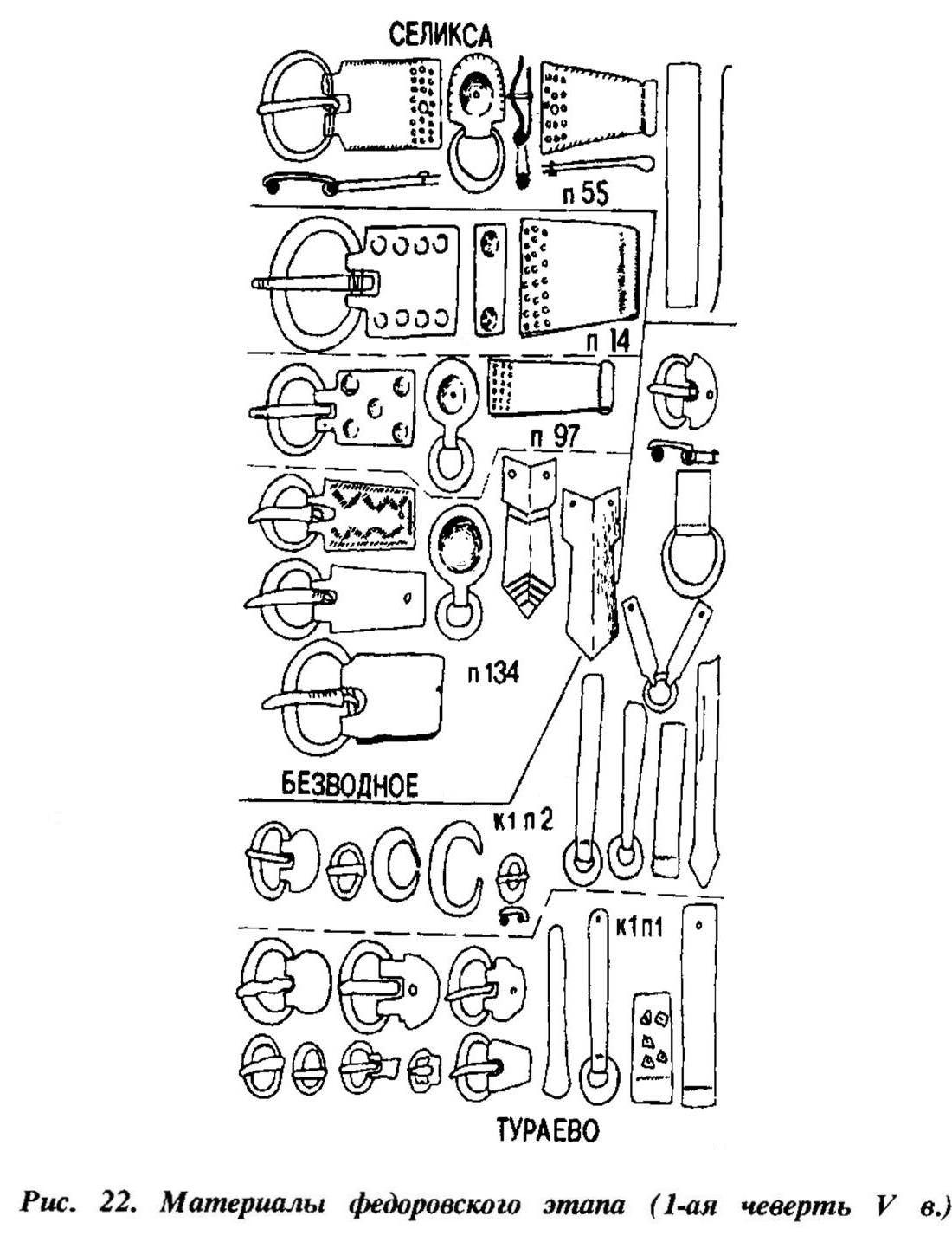 В итоге шесть этапов эволюции средневолжской поясной гарнитуры были датированы: тезиковский (III-IV вв.), фёдоровский (первая четверть V в.), тураевский (V — первая половина VI в.), новосёлковский (третья четверть VI в.), зиновьевский (вторая половина VI — VII вв.), брусянский (конец VII — первая половина VIII вв.).