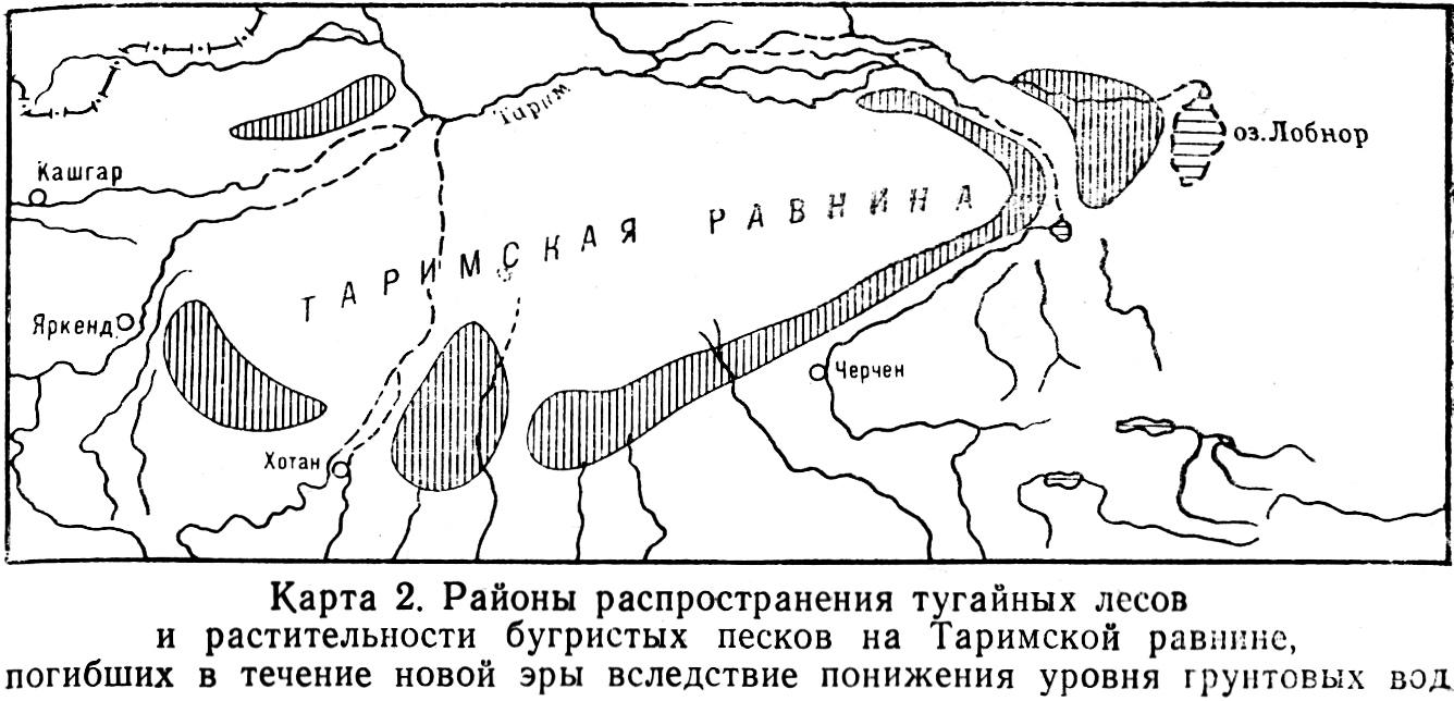 чем сейчас. Это предположение вполне согласуется с выводами В.М. Синицына, что и отражено на его приведённой выше карте (см. карту 2), по которой видно, что 2 тыс. лет тому назад в этом регионе был большой оазис тугайных лесов.