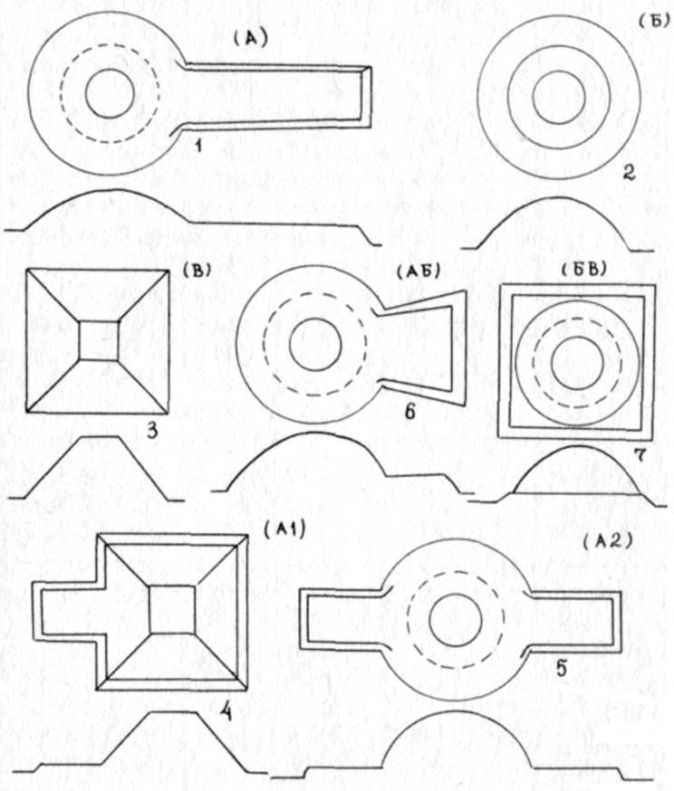 1 — прямоугольно-круглый курган (А); 2 — круглый курган (Б); 3 — квадратный курган (В); 4 — курган, квадратный спереди и сзади (A1); 5 — курган, круглый в середине и прямоугольный с двух сторон (А2); 6 — курган в форме морского гребешка (АБ); 7 — курган, круглый сверху и квадратный снизу (БВ).