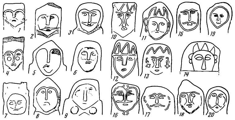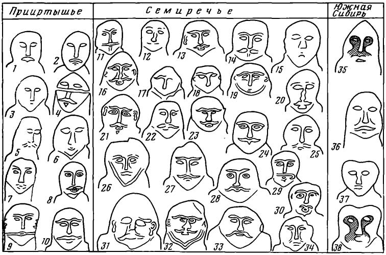 Судя по количеству, центром бытования изваяний с подпрямоугольными очертаниями головы (рис. 2, 5) было Прииртышье. Эта форма занимает наибольший ареал — от Тувы до Западного Казахстана. Широкое территориальное распространение имели также и изваяния с округлой (яйцевидной) головой (рис. 2, 4). Таблица даёт наглядное представление о постепенном их количественном росте с востока (Тува) к западу (Семиречье). Всего насчитывается 50 изваяний с подобной трактовкой головного убора, но более всего их в Прииртышье и Семиречье (37 экз.). Интересно, что внутри данной группы статуй можно выделить дополнительно (по изобразительным признакам) характерные черты, свойственные каждой из этих областей. По манере изображения глаз среди них различаются «безбровые» лица и статуи с выпуклыми, слегка изогнутыми бровями, соединёнными с носом (рис. 3). Чаще всего «безбровые» лица встречены на прииртышских скульптурах данной группы (рис. 3, 1-6). В Семиречье же, наоборот, преобладают памятники второй подгруппы: из 27 изваяний только одно (рис. 3, 15) безбровое. Безбровый вариант зафиксирован и на нескольких алтайских фигурах, [17] но там |