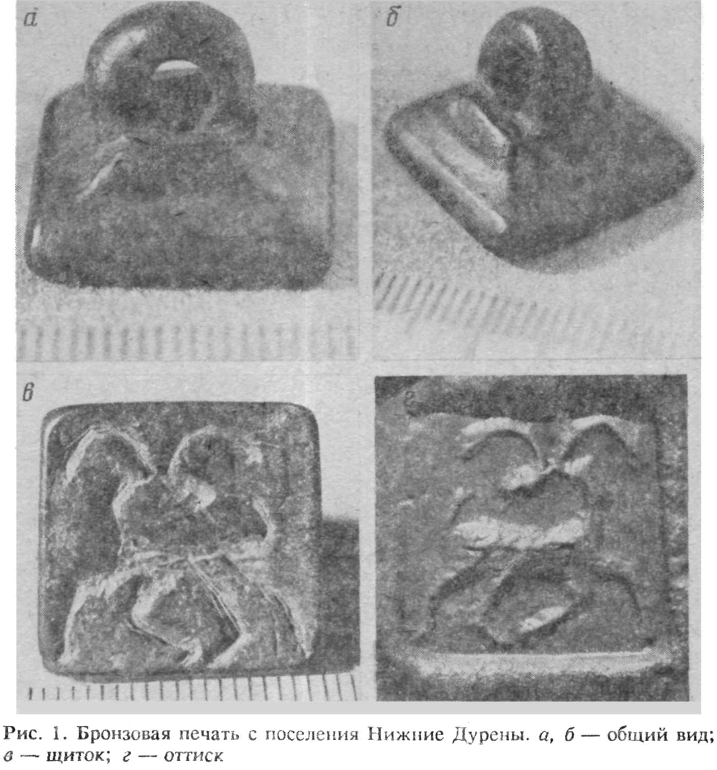 В 1979 г. на поселении сюнну Нижние Дурёны на р. Чикое (Кяхтинский р-н, Бурятская ССР) в раскопе 3 в 1-1,5 м от жилища 6 (в кв. 132в, шт. 2) была найдена бронзовая печать (рис. 1).