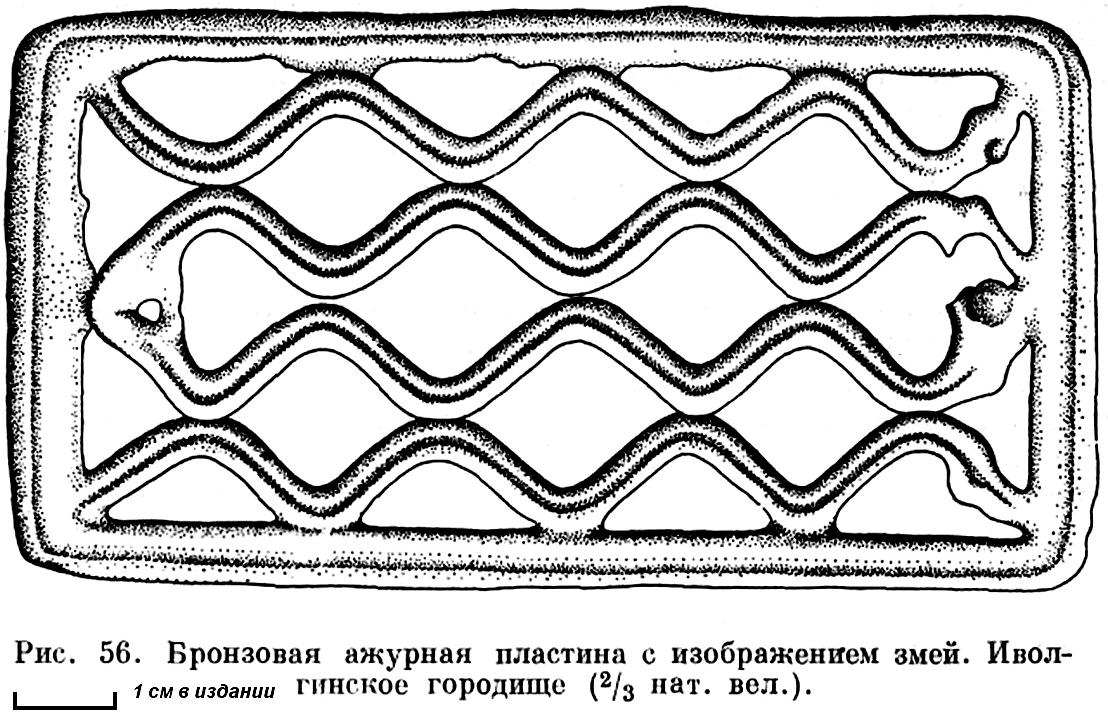Волнистую решётку образуют плавно извивающиеся туловища четырёх змей, которые размещены одна над другой внутри прямоугольной рамки (рис. 1). Головы животных примыкают к одной боковой стороне рамки, хвосты — к другой. Между соприкасающимися и волнообразно расходящимися змеиными телами сквозные отверстия имеют подромбическую форму, а между рамкой и изгибами туловищ — подтреугольную. Вдоль хребтов змей проходит один или несколько узких желобков. Такими же желобками украшались рамки. Иногда в процессе многократных воспроизведений пластин желобки на рамках превращались в нерегулярные штрихи или исчезали совсем. Отливка ажурных блях производилась в глиняных формах с употреблением в качестве моделей уже готовых изделий. Возражая против мнения о том, что бляхи отливались в одних и тех же формах, Ю.С. Гришин на примере прямоугольных блях в виде пары стоящих быков показал, что при сходстве даже мельчайших деталей у каждой пластины можно наблюдать различную степень их выраженности: у одних эти детали выступают более отчётливо, у других менее, а у третьих выглядят как бы совсем «смазанными». [8] Видимо, по одной модели могли быть сделаны две пластины, найденные в с. Марьясово и хранящиеся в Минусинском музее. При общем совпадении друг с другом они имеют различия в отдельных деталях. На этих пластинах изображения змей приобрели чисто орнаментально-декоративный характер: головы и хвосты не обозначены, туловища гладкие. Понять, что на них представлены змеи, можно лишь по аналогии с образцами, в меньшей степени утратившими черты оригинала.