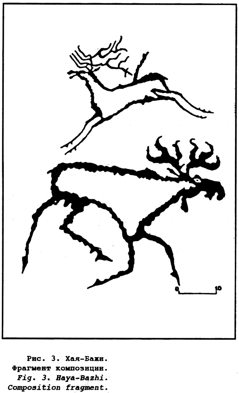 что это рукоятка ножа или кинжала. К тому же тувинцы ездят верхом только на северных оленях, а здесь представлены благородные олени — маралы. Животные мчатся, распластавшись в прыжке по наклонной справа налево. В отличие от описанных ранее случаев, у них по два рога, туловища выполнены контурной выбивкой. Изображение лося помещено в нижнем левом углу. Животное обращено вправо, одна передняя нога и одна задняя подогнуты под брюхо в стремительном беге. В этой композиции обращает на себя внимание тот факт, что животные, несущие на себе признаки насильственной кончины, уже наставшей, или неизбежной вследствие ранения, обращены влево.
