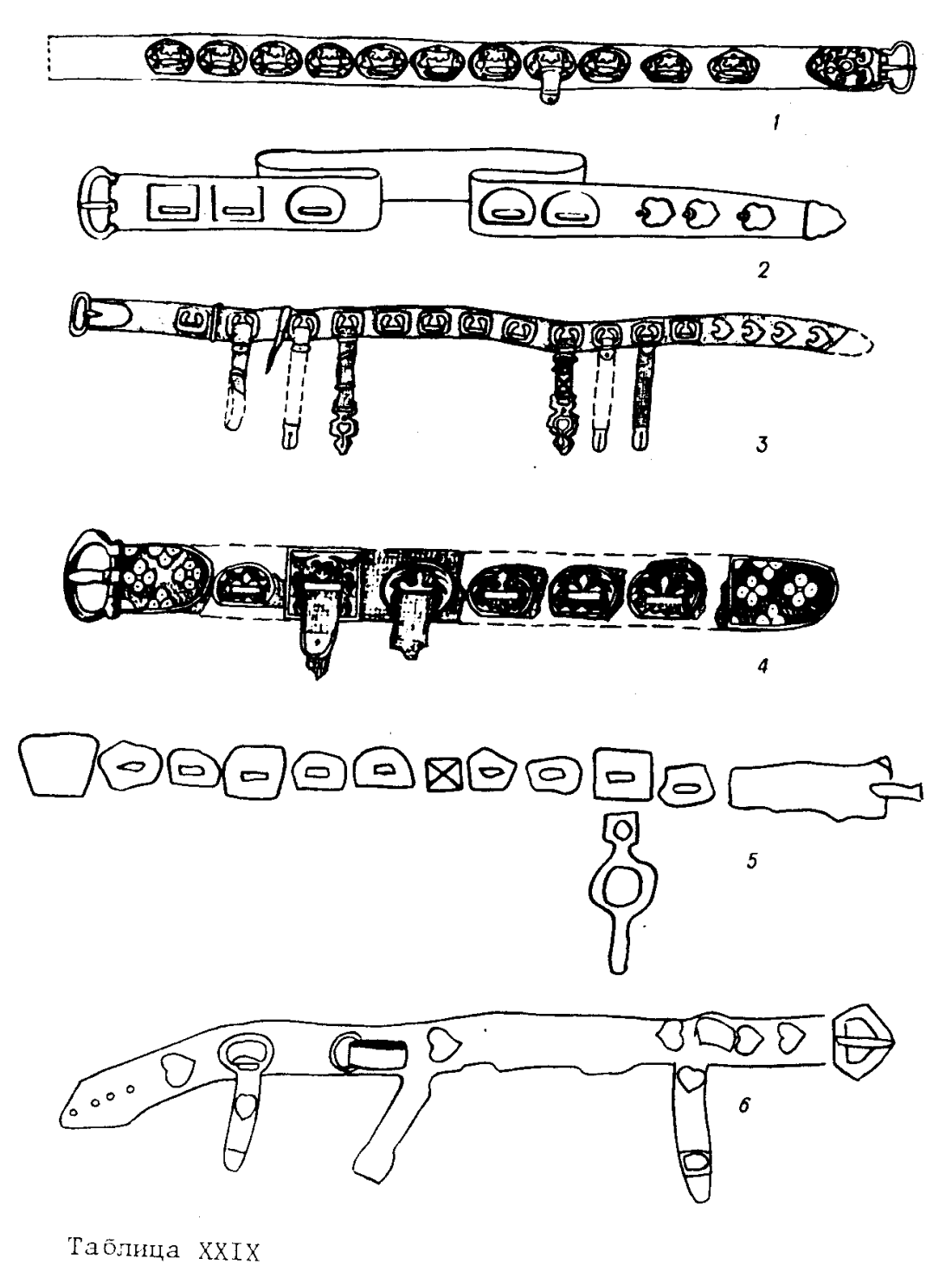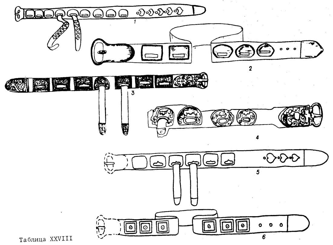 В I в. н.э. в Минусинской котловине зарождается, получает развитие и существует вплоть до эпохи раннего средневековья новая культура — таштыкская. Многие элементы материальной культуры таштыкцев не имеют местных корней и выходят за пределы Минусинской котловины. Не прослеживаются в предшествующее время и истоки таштыкского пояса. Таштыкский наборный пояс состоял из наременных блях и размещённых между ними пряжечек, обращённых вниз, для подвешивания оружия и других предметов. Наременные бляхи однотипны: это три четырёхугольных обоймы, между которыми расположены овальные кольца с помещёнными внутри парными волютами (табл. XVIII, 3). [68] Такие пояса были довольно популярны, о чём свидетельствуют частые находки их элементов в таштыкских склепах. [69]