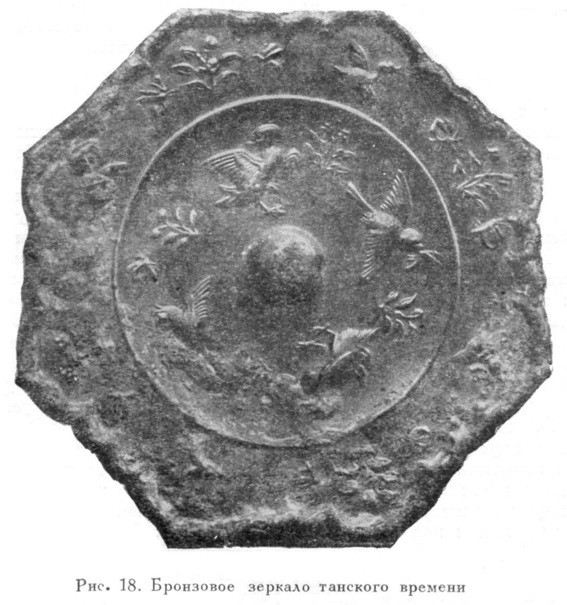 Ближайшие аналогии нашим птичкам мы опять же находим в танских древностях. Так, на бронзовом зеркале из коллекции Лу, украшенном рельефным растительным орнаментом и фигурками зверей и птиц, мы видим совершенно таких же птичек, как наши, в различных позах полёта. [6] На другом бронзовом зеркале танской же династии одна из пти-