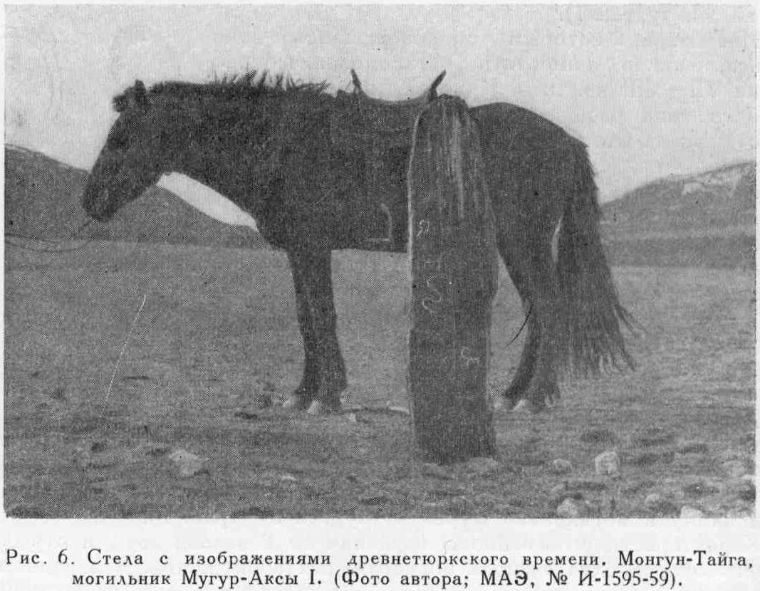 №1 находится каменная стела, вертикально врытая в землю; высота стелы 1.3 м (рис. 6). На восточной плоскости этой стелы имеется ряд трудно различимых изображений, одно из которых, однако, прослеживается довольно хорошо и представляет собой изображение горного козла того же типа, что и открытые нами несколько позднее изображения среди петроглифов в горах Бай-Тайги и Барун-Хемчика. Эти петроглифы, получившие наименование изображений «типа Чуруктуг-Кырлан» (по месту открытия первой в Туве массовой их группы), на основании данных сравнительного анализа датируются древнетюркским временем 1. [21]
