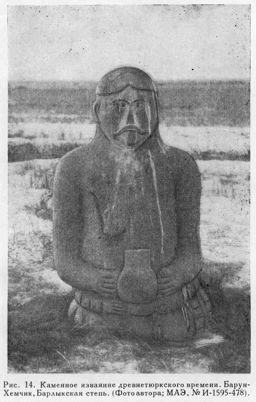 Помимо неопубликованных ранее изваяний, автор настоящей работы в течение сезона полевых работ 1953 г. обследовал еще семь различных каменных изваяний — три изваяния в районе Булуна (Бай-Тайга) 3, [35] два изваяния в 2 км от скал Бижиктиг-Хая (Барун-Хемчик) 4, [36] находящихся возле каменной оградки тюркского времени (ориентация оградки по странам света, размеры 4.9×5.4 м), одно изваяние в степи Манайлыг-Хову (Дзун-Хемчик) 5 [37] и, наконец, ещё одно изваяние в Барлыкской степи, в виду скал Бижиктиг-Хая (Барун-Хемчик). Нет нужды особо подробно останавливаться на характеристике всех этих уже известных в литературе каменных изваяний. Однако на характеристике одного из них — памятника в Барлыкской степи (с соответствующим сравнением его со статуей в степи Манайлыг-Хову) — стоит остановиться более или менее обстоятельно.