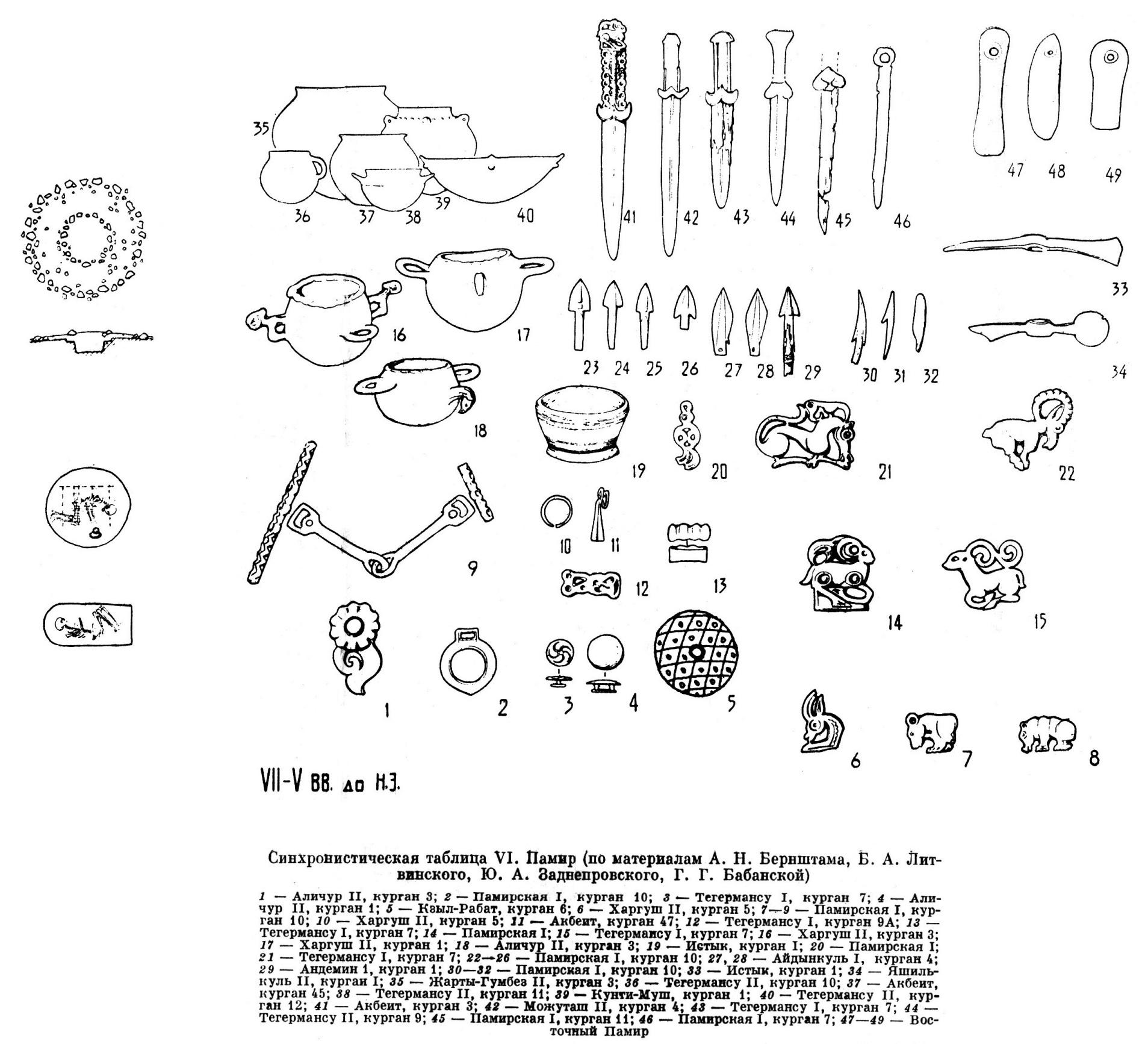 1 — Аличур II, курган 3; 2 — Памирская I, курган 10; 8 — Тегермансу I, курган 7; 4 — Аличур II, курган 1; 5 — Кзыл-Рабат, курган 6; 6 — Харгуш II, курган 5; 7-9 — Памирская I, курган 10; 10 — Харгуш II, курган 5; 11 — Акбеит, курган 47; 12 — Тегермансу I, курган 9А; 13 — Тегермансу I, курган 7; 14 — Памирская I; 15 — Тегермансу I, курган 7; 16 — Харгуш II, курган 3; 17 — Харгуш II, курган 1; 18 — Аличур II, курган 3; 19 — Истык, курган I; 20 — Памирская I; 21 — Тегермансу I, курган 7; 22-26 — Памирская I, курган 10; 27, 28 — Айдынкуль I, курган 4; 29 — Андемин 1, курган 1; 30-32 — Памирская I, курган 10; 33 — Истык, курган 1; 34 — Яшилькуль II, курган I; 35 — Жарты-Гумбез II, курган 3; З6 — Тегермансу II, курган 10; 37 — Акбеит, курган 45; 38 — Тегермансу II, курган 11; 39 — Кунти-Муш, курган 1; 40 — Тегермансу II, курган 12; 41 — Акбеит, курган 3; 42 — Можуташ II, курган 4; 43 — Тегермансу I, курган 7; 44 — Тегермансу II, курган 9; 45 — Памирская I, курган 11; 46 — Памирская I, курган 7; 47-49 — Восточный Памир.