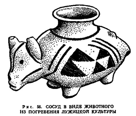 кладку из неровных камней. Кроме урны в могилу ставили ещё несколько сосудов, иногда до 20-30 штук. Клали также отдельные орудия и оружие в целом, необгоревшем виде. В ранний период — это бронзовые изделия, позднее — железные; то серп, то копьё, то стрелы, то каменная зернотёрка и т.п. В детские могилки частенько клали грушевидные, шаровидные и в виде животных погремушки из глины. Иногда образ животных придавали кубкам, сосудам, подвескам и каким-то, может быть, культовым символам (рис. 56). В раннюю эпоху над некоторыми из ям сооружали курганы, то каменные, то земляные. К. Шухгардт полагал, что курганы вообще были более распространены, чем это представляется теперь археологам, что иные из них исчезли в результате распашки. [8] По его наблюдению, курганы лучше сохранились в местах, покрытых лесом. Не вполне исчезли курганы и в позднейшее время, в гальштатскую эпоху. Так, Королевский курган около Седдина в ГДР — это большой курган диаметром около 70 м и высотой 11 м. Под курганом находилась обширная круглая яма. Большая лужицкая глиняная урна содержала внутри выбитую из бронзового листа чеканную италийскую миску с крышкой, в которую и были ссыпаны кости сожжённого воина. В урне лежали: бронзовый серп, бронзовая булавка для закалывания одежды, бронзовая бритва. В состав инвентаря входило несколько бронзовых кубков, ситулы, бронзовый меч гальштатского типа с навершием в виде завитков. Как и бронзовая миска, многие вещи здесь италийских образцов и даже изготовления. Сосуды в этом погребении позднелужицкого типа с глубоким горизонтальным рифлением. Погребение относится к VII-VI вв. до н.э. [9]