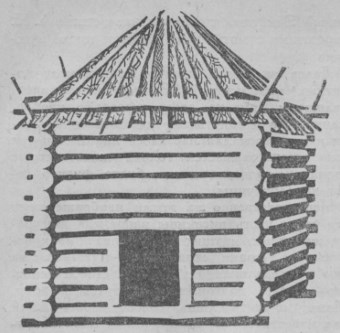 Менее понятна крайняя левая постройка. Силуэтное изображение её не даёт уверенности в правильности определения её назначения, её конструкции и материала, из которого она сделана. Может быть, постройка совершенно аналогична описанным трём средним, но выполнена иным способом, может быть другим лицом, и потому отличается от них по внешнему виду. Вместе с тем не исключена и другая возможность её объяснения. Не является ли она другим типом постройки? Не сделана ли она из другого материала и для другого назначения? Если это так, то отсутствие на рисунке дверей может быть и не случайным. Возможно, что эта постройка, стоящая в некотором отдалении от других, не жилище, а общественный амбар или другое какое-нибудь хозяйственное строение. Возможно также, что и самая правая дерновая постройка тоже не является жилищем одной из семей, а выполняет роль общественного дома. Это тем более вероятно, что рядом с постройкой стоит мужчина,