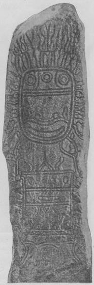 огромной сигары (рис. 4 или в тексте рис. 7 и 38), с лицом, находящимся также в нижней половине или в средине. Если для памятника употреблена плоская плита, и её верх закруглён, то лицо расположено на широкой грани вверху или в центре плиты (рис. 46 и 55).