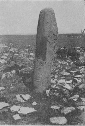 У памятника, изображённого на рис. 20, верх обломан, и вся поверхность сильно сглажена, так что на выдающемся плоском лице с трудом удалось установить наличие нижней горизонтальной черты и рот, а на широком ребре камня — следы круга с уголками.