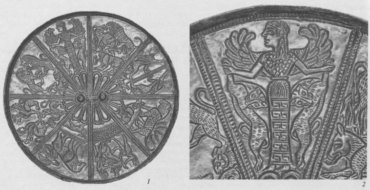 Fig. 1. Winged goddess Cybele with two panthers. Silver mirror (1) with electrum inset and detail (2). Second half of the 7th century ВС. Kelermes barrow 4.