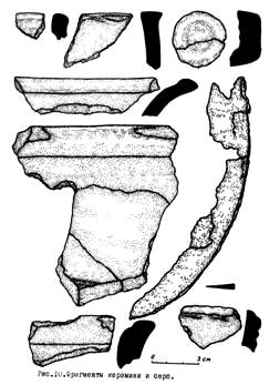В Кургане № 3, более основательно ограбленном, обнаружены только фрагменты венчика и шейки кыргызской вазы с полосой штампованного орнамента, фрагменты лепных горшков с прямым или отогнутым венчиком, пряслице из стенки кыргызской вазы и железный серп. В сопроводительных захоронениях найдены фрагменты «кыргызской вазы» и лепных горшков. Не вполне ясно назначение керамического изделия в виде расширяющегося плоскодонного цилиндра. Вероятно это утолщённое дно или поддон небольшого сосуда (рис. 10).