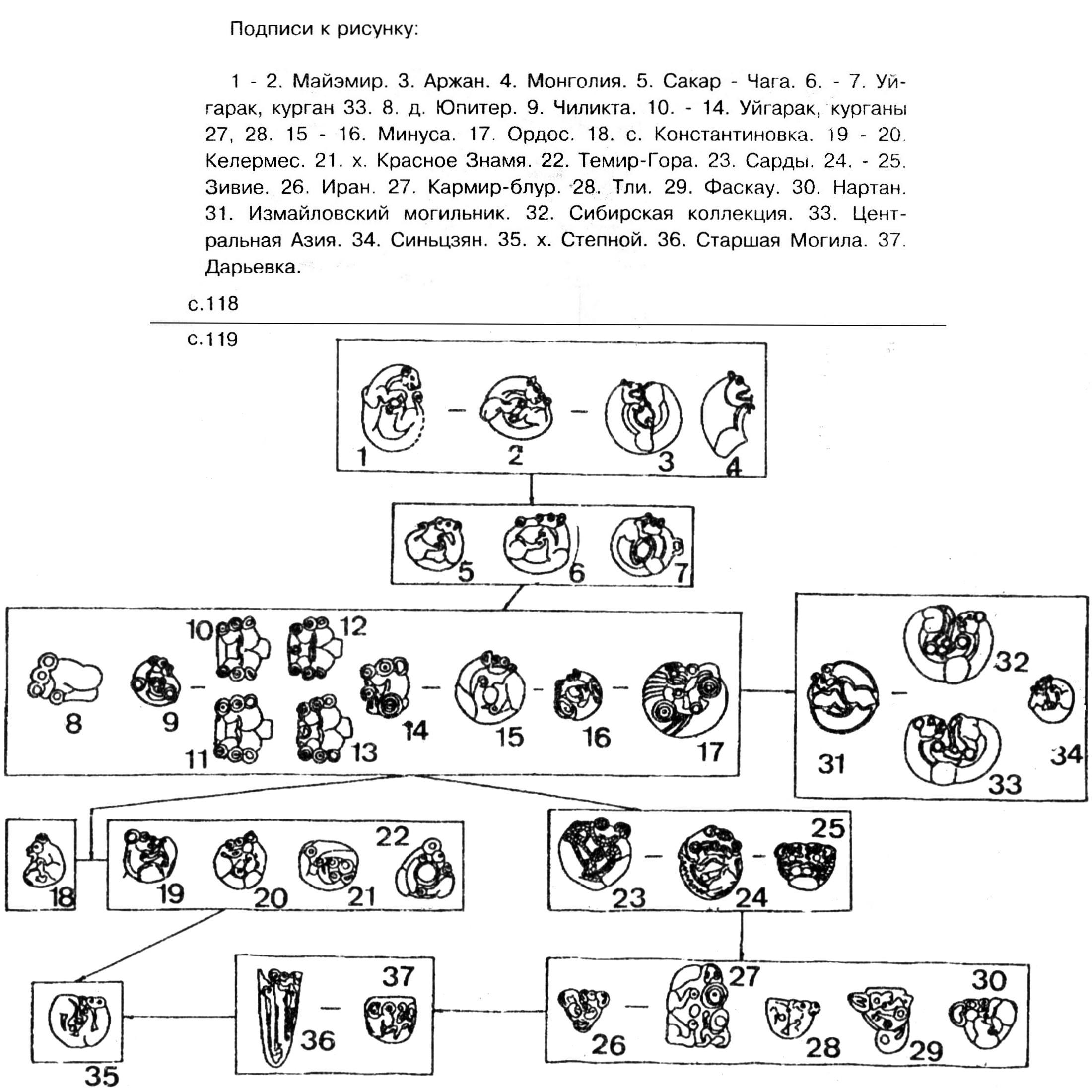 1.-2. Майэмир. 3. Аржан. 4. Монголия. 5. Сакар-Чага. 6.-7. Уйгарак, курган 33. 8. д. Юпитер. 9. Чиликта. 10-14. Уйгарак, курганы 27, 28. 15.-16. Минуса. 17. Ордос. 18. с. Константиновка. 19.-20. Келермес. 21. х. Красное Знамя. 22. Темир-Гора. 23. Сарды. 24.-25. Зивие. 26. Иран. 27. Кармир-блур. 28. Тли. 29. Фаскау. 30. Нартан. 31. Измайловский могильник. 32. Сибирская коллекция. 33. Центральная Азия. 34. Синьцзян. 35. х. Степной. 36. Старшая Могила. 37. Дарьевка.