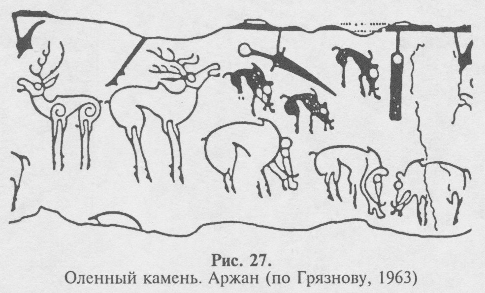 [7] 1 Автор в полной мере сознаёт уязвимость предложенной гипотезы, тем более что находки последних лет из кургана Аржан-2 продемонстрировали вполне сложившуюся схему оленьих рогов на предметах, датируемых раннескифским временем [Чугунов, Парцингер, Наглер, 2002, рис. 16].