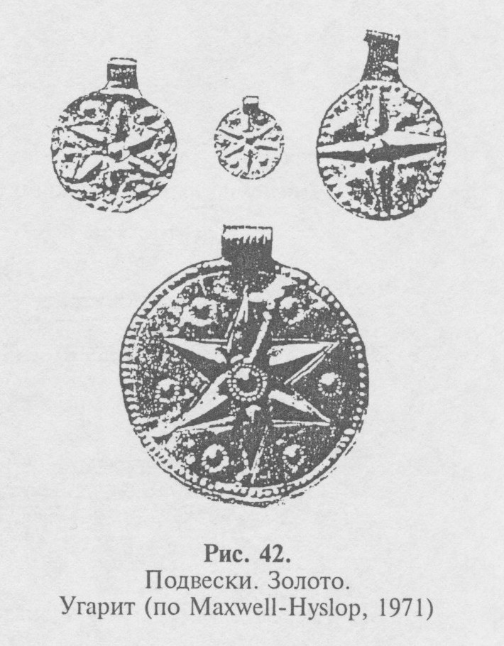 Рубчатые полосы, ограничивающие сектора, находят близкие подобия на кувшине VII в. до н.э. из Ларисы на о. Гермос [Максимова, 1954, с. 286], украшениях 640-620-х гг. до н.э. с о. Родос [Mer Egée. Grèce des Iles, 1979, N92-96] и большинстве архаических греческих гемм [Furtwängler, 1900, S. 286], а также на золотой пластине из Зивие [Ghirshman, 1964, ill. 386], бронзовой пластине X-IX вв. до н.э. и серебряной рукоятке кинжала VIII-VII вв. до н.э. из Луристана [Ghirshman, 1964, ill. 386; Ванден-Берге, 1992, кат. 270].