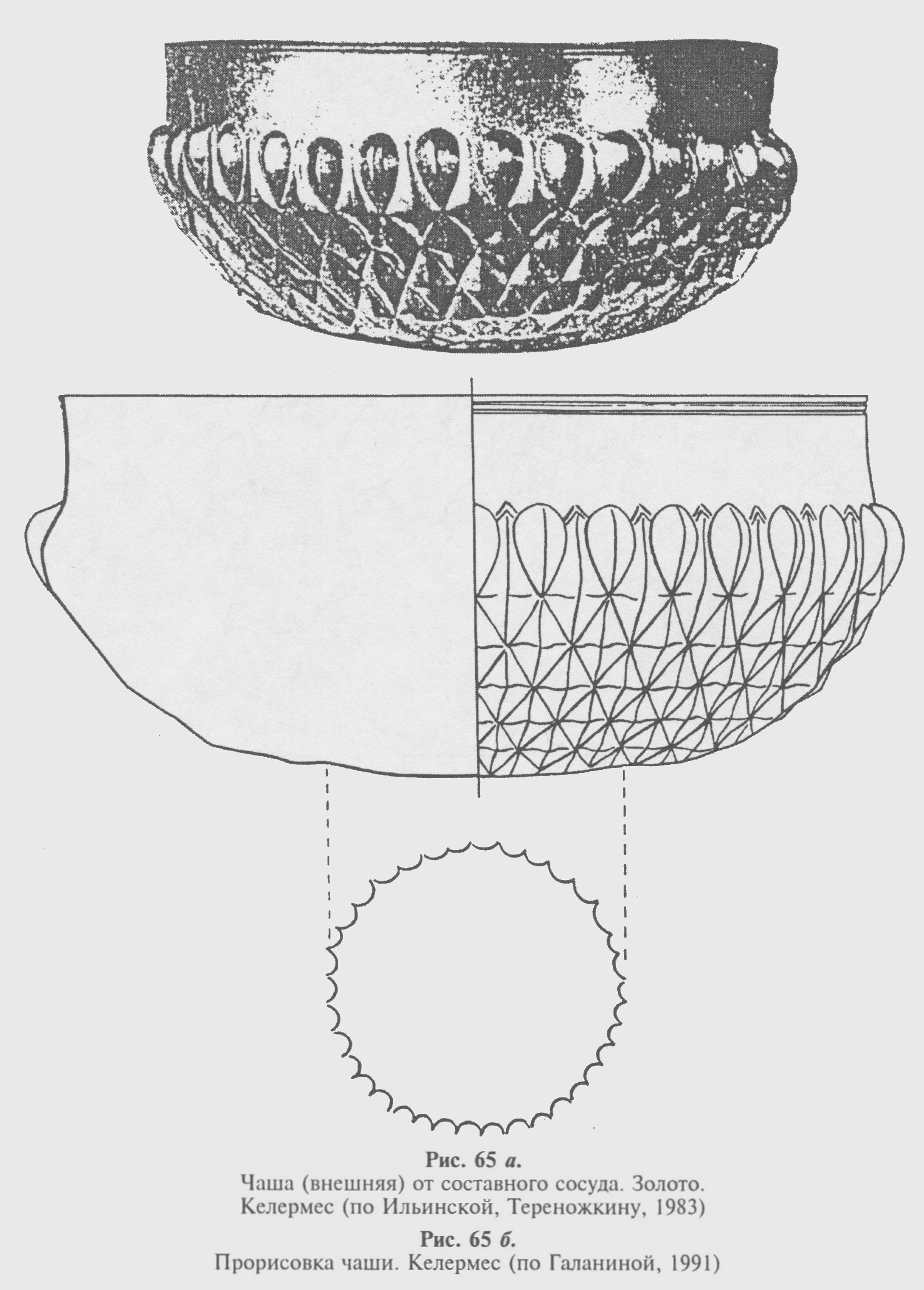 [25] 1 Косвенным подтверждением может служить устойчивая традиция изготовления составных сосудов на Ближнем Востоке и в Закавказье: золотой кубок II тыс. до н.э. из Триалети [Тавадзе, Баркая, 1954, с. 364-368, рис. 9], золотая ахеменидская амфора V в. до н.э. из Филипповского кургана 1 [The Golden Deer, 2001, fig. 93], золотая чаша IV-III вв. до н.э. из Ирана (?) [Иванов, Луконин, Смесова, 1984, с. 22, №[27]31], серебряные с позолотой византийские братины XII-XIII вв. н.э. [Банк, 1938, с. 256-260; Даркевич, 1975, с. 63, 81, №3, 4], серебряная с позолотой чаша XV в. н.э. из Грузии [Jewellery and Metalwork 1986, pl. 216].