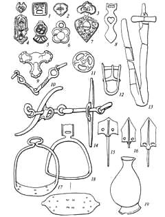 1 — Семипалатинск (по А.А. Спицыну); 2 — Когалы (по З.С. Самашеву, Н.А. Боковенко); 3, 6, 7 — Юпитер (раскопки С.С. Черникова); 4 — Пчела (раскопки С.С. Черникова); 5, 21 — Орловский могильник (по Ф.X. Арслановой); 8, 13 — Зевакино (по Ф.X. Арслановой, С.Г. Кляшторному); 9, 10 — Кызыл-Ту (раскопки С.С. Черникова); 10-12, 14, 19, 20 — Славянка (раскопки С.С. Черникова); 15-18 — наконечники стрел из раскопок С.С. Черникова (по Ю.С. Худякову).