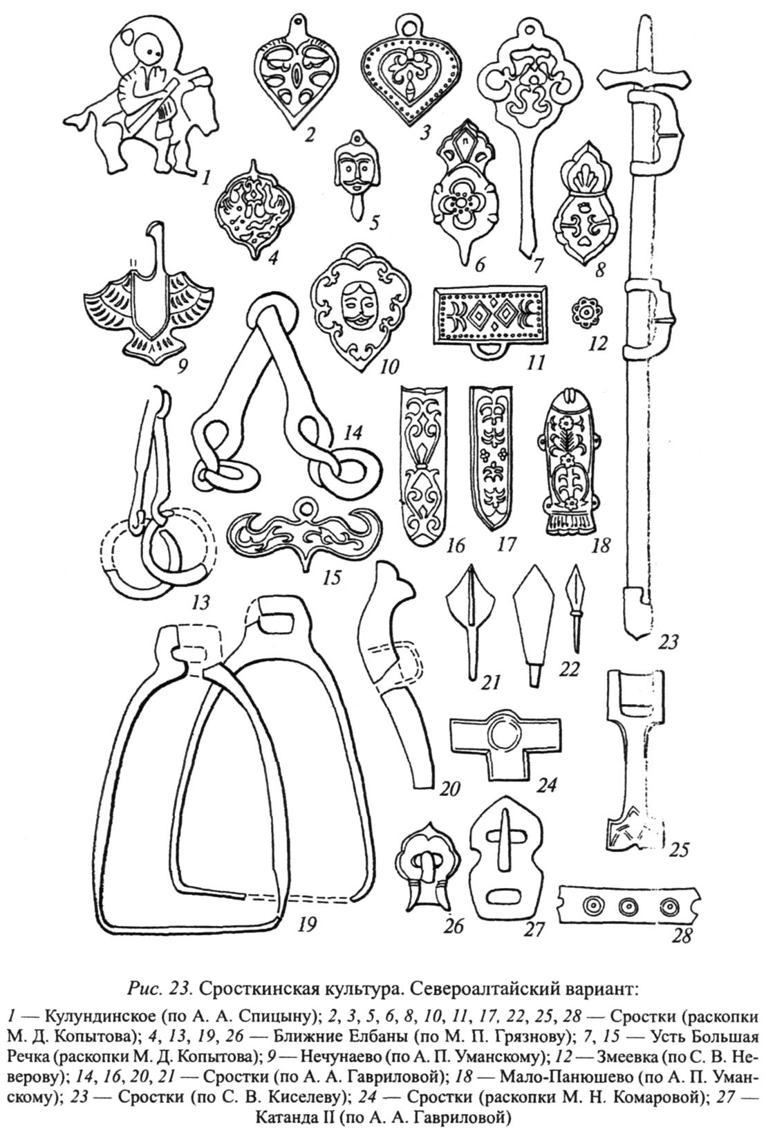 1 — Кулундинское (по А.А. Спицыну); 2, 3, 5, 6, 8, 10, 11, 17, 22, 25, 28 — Сростки (раскопки М.Д. Копытова); 4, 13, 19, 26 — Ближние Елбаны (по М.П. Грязнову); 7, 15 — Усть Большая Речка (раскопки М.Д. Копытова); 9 — Нечунаево (по А.П. Уманскому); 12 — Змеевка (по С.В. Неверову); 14, 16, 20, 21 — Сростки (по А.А. Гавриловой); 18 — Мало-Панюшево (по А.П. Уманскому); 23 — Сростки (по С.В. Киселёву); 24 — Сростки (раскопки М.Н. Комаровой); 27 — Катанда II (по А.А. Гавриловой).