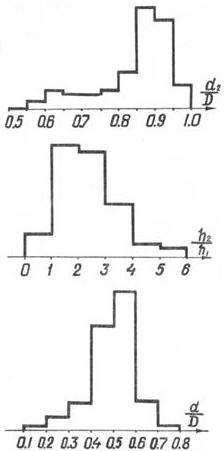 Показатель «закрытости» приведённых Кызласовым представителей типа 13 Бочонковидный I (штрих-пунктирные линии), обнаруживает отличие от соответствующего показателя «баночных» (по Кызласову) сосудов значительным промежутком в интервале значений d2: D от 0,75 до 0,85. Кроме того, различимы они, в отличие от «баночных», и по уровню максимального диаметра (для типа 13 h2: h1 < 1, 5); впрочем, последний признак не дискретен (ср. рис. 4).