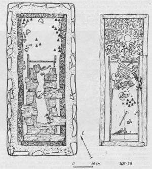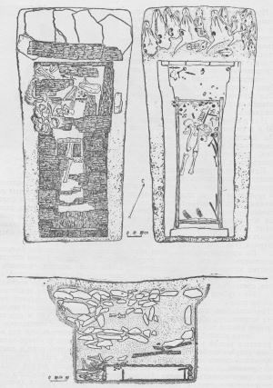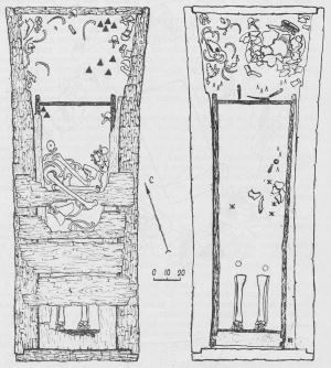 ^ Рис. 31. [стр. 58] ИП-52. Сруб, гроб и кладовая для жертвоприношений, закрытая сверху каменными плитами.