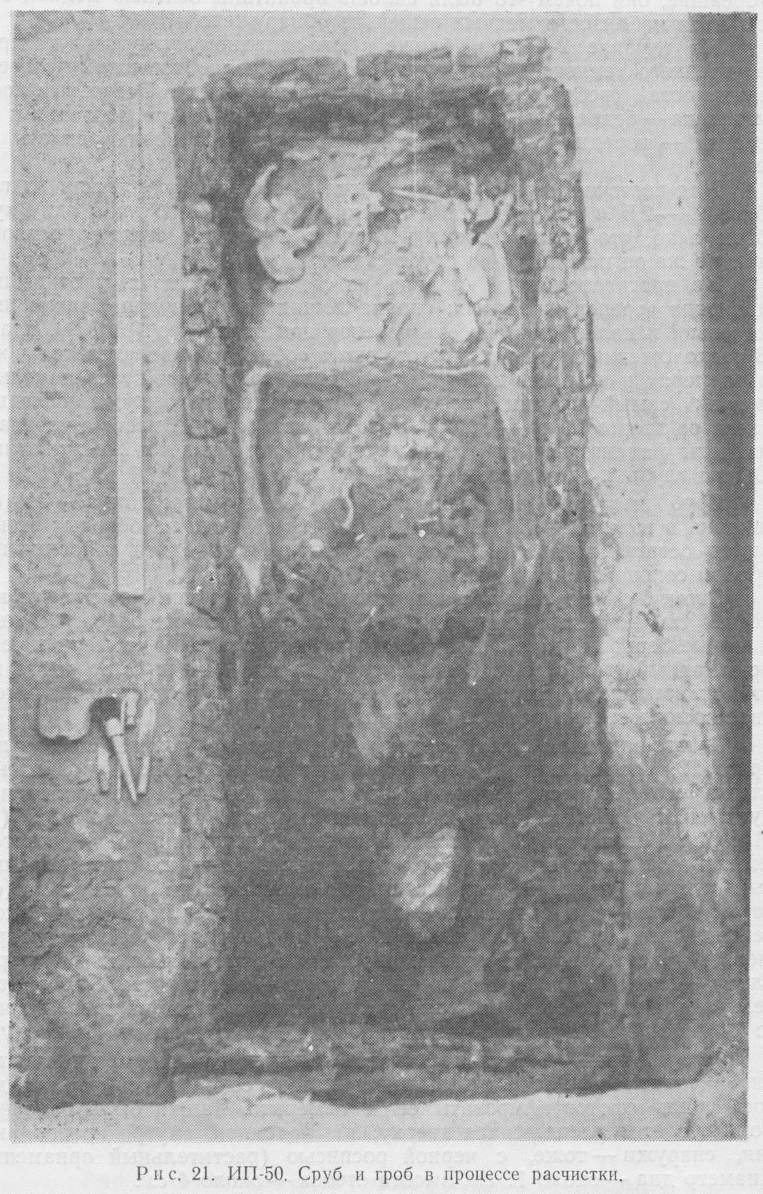 ^ Рис. 21. [стр. 48] ИП-50. Сруб и гроб в процессе расчистки.