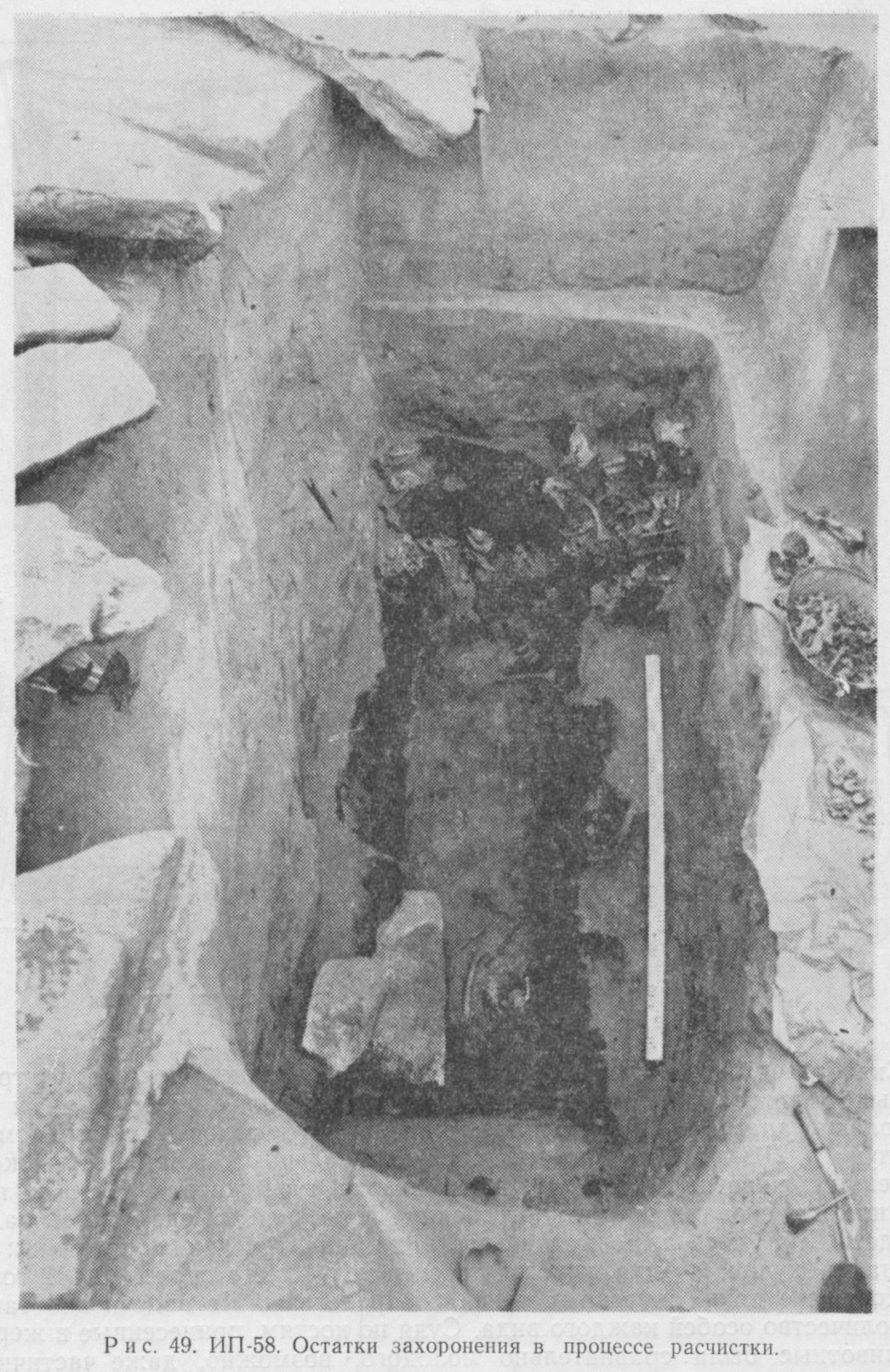 ^ Рис. 49. [стр. 78] ИП-58. Остатки захоронения в процессе расчистки.