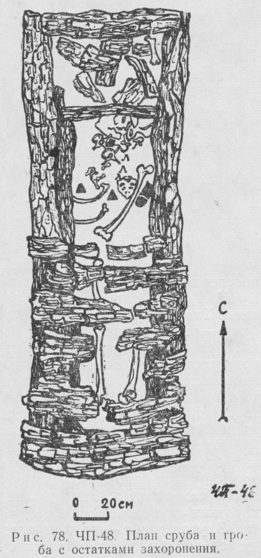 ^ Рис. 78. [стр. 107] ЧП-48 План сруба и гроба с остатками захоронения.