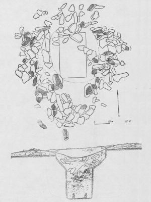 ^ Рис. 34. [стр. 61] ИП-53. Разрушенная надмогильная кладка после расчистки.
