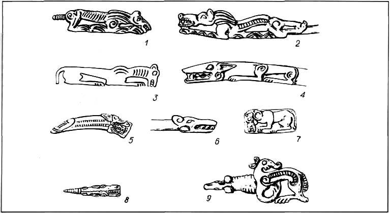 кации В.Г. Петренко (48, рис. 240, 125; 34, табл. 32; 2, 1; 29, рис. 33). Почти во всех перечисленных случаях такое декоративное оформление гривен сочетается с фигурными окончаниями в виде скульптурно выполненных изображений «припавших к земле» хищников. Сама поза животного и черты, которые придают ему некоторую волкообразность (несколько вытянутая морда, заострённые уши) характерны для восточных регионов и распространены на территории Приуралья, Казахстана и Сибири.