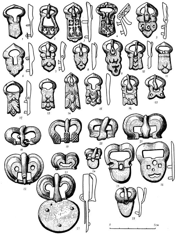 Рис. 5. Табл. I. Круглорамчатые и сегменторамчатые пряжки (типы 1-9).