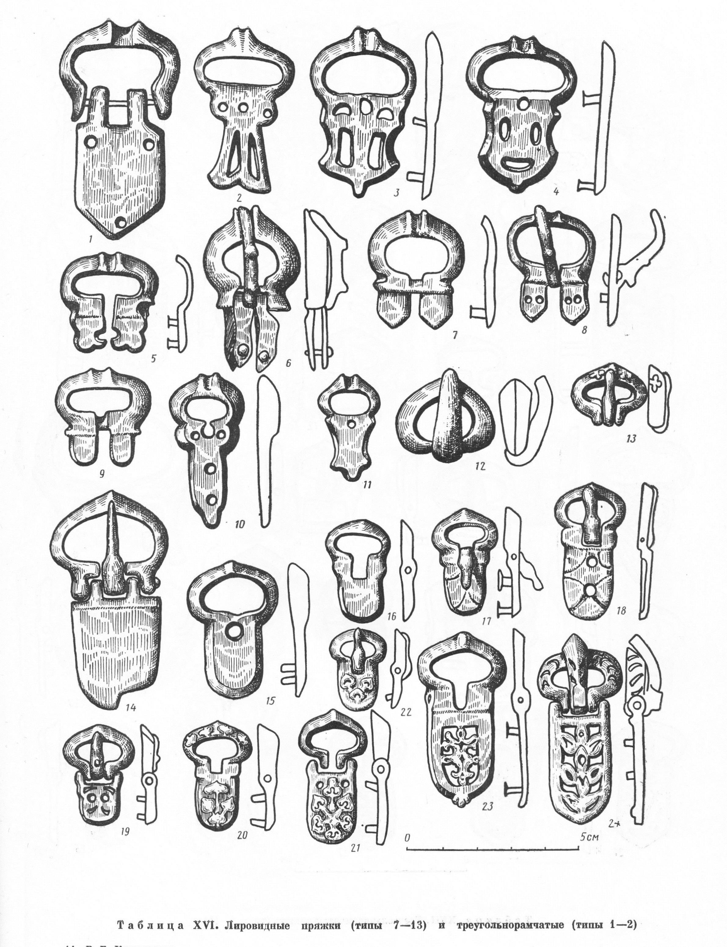 Рис. 20. Табл. XVI. Лировидные пряжки (типы 7-13) и треугольнорамчатые (типы 1-2).