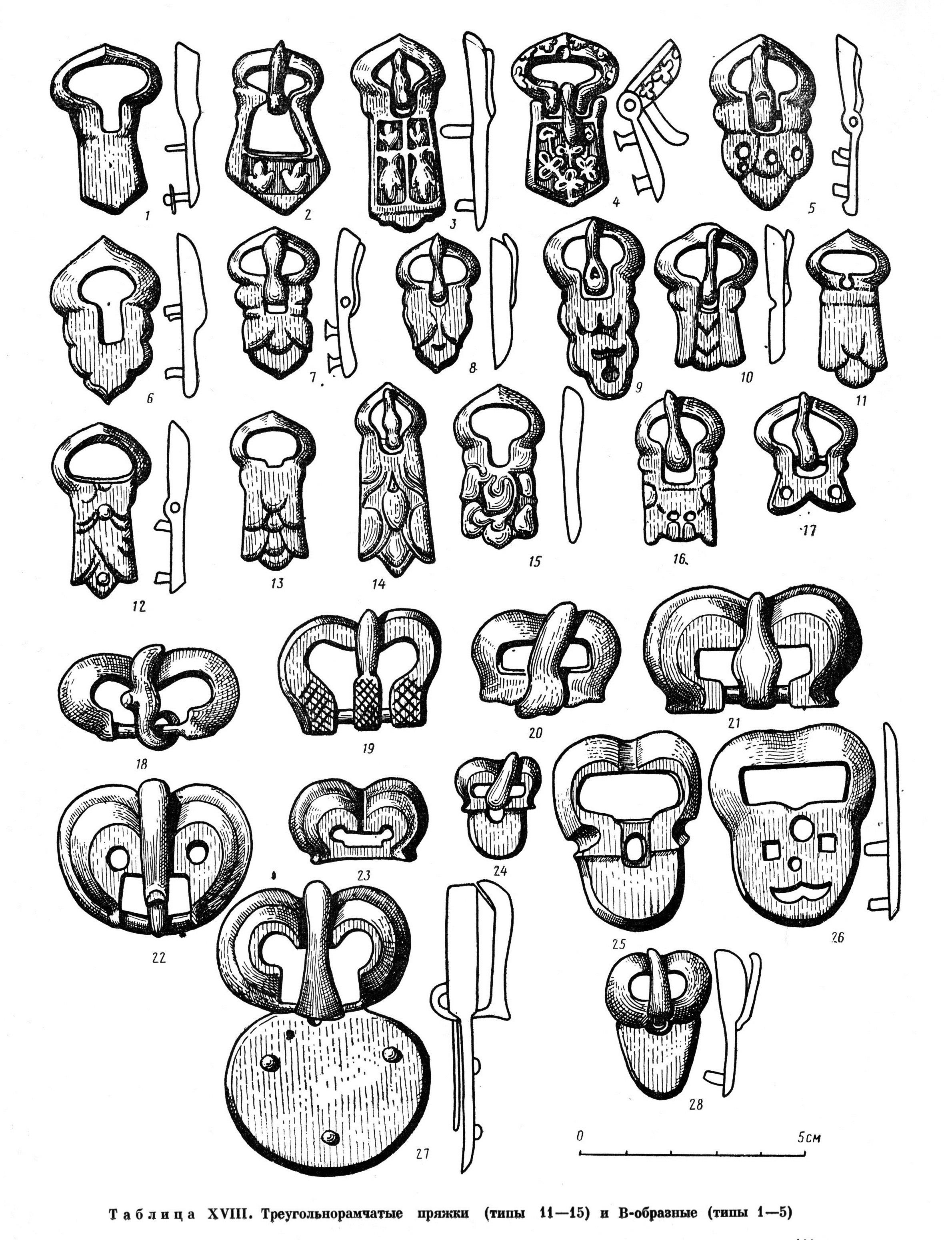 Рис. 21. Табл. XVII. Треугольнорамчатые пряжки (типы 2-10).
