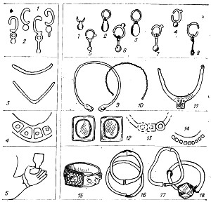 Левая сторона: 1-5 — серьги, гривны, ожерелья и браслеты на изваяниях; правая сторона: 1-4 — серьги первого типа (Кудыргэ, Сростки — Алтай), 5-8 — серьги второго типа (Сростки, Курай — Алтай), 9 — золотая гривна из Тугозвоновского погребения на Чарыше (Алтай), 10, 11 — витая и пластинчатая гривны из средневековых погребений на Ближних Елбанах (Алтай), 12 — золотые бляхи со вставкой сердолика (Казахстан), 13 — ожерелье на персонаже из настенных росписей Афрасиаба (VII в.), 14 — ожерелье на одной из половецких статуй, 15, 16 — золотые браслеты из Перещепинского клада, VII в. (Полтавская обл.), 17 — серебряный браслет из Копёнского чаатаса (Хакасия), 18 — браслет из северокавказского погребения средневековых кочевников.