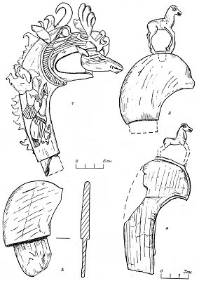 В отдельных случаях разнообразие этих персонажей, их местонахождение свидетельствуют о существовании нескольких видов головных уборов пазырыкцев. Реконструкция их — дело будущего, а пока можно говорить лишь об отдельных, несомненно главных, деталях мужских головных уборов, отличающих их от женских. Прежде всего следует указать на редкое деревянное навершие из второго пазырыкского кургана (рис. 2, 1). Оно представляет собой изображение головы грифа с оленьей головой в клюве. «Условна, но чрезвычайно выразительна голова грифа с мощным клювом, выкрашенным в красный цвет, большой, подчёркнутой восковицей и воротничком, выкрашенным в жёлтый цвет, с большими рельефно вырезанными глазами. Гребень, идущий от темени по всей длине шеи, и уши кожаные. Скульптурно выполненная голова хорошо моделирована, с бровями, выкрашенными в красный цвет. Уши и лопастные рога оленя кожаные. На плоской шее описанной фигуры — головы грифа — с обеих сторон в рельефе вырезана одна и та же сцена: гусь в лапах грифа». [8] В основании навершия вырезан шип для его крепления. Назначение этого навершия, одного из ярчайших образцов алтайского «звериного» стиля, до сих пор было неизвестно. Нахождение его в головной части саркофага-колоды всё того же второго пазырыкского кургана, а самое главное — сходство формы и крепления с аналогичными навершиями из уландрыкских курганов определяют этот предмет как навершие мужского головного убора. [9] Несравненно более скромные, но подобные по конструкции навершия из Уландрыка и Юстыда представляли собой деревянные пластины в форме половинки луны. Они сходны по форме, так же, как и пазырыкское навершие, крепились к головному убору при помощи уплощённых шипов, Отличительной, можно сказать, самобытной чертой