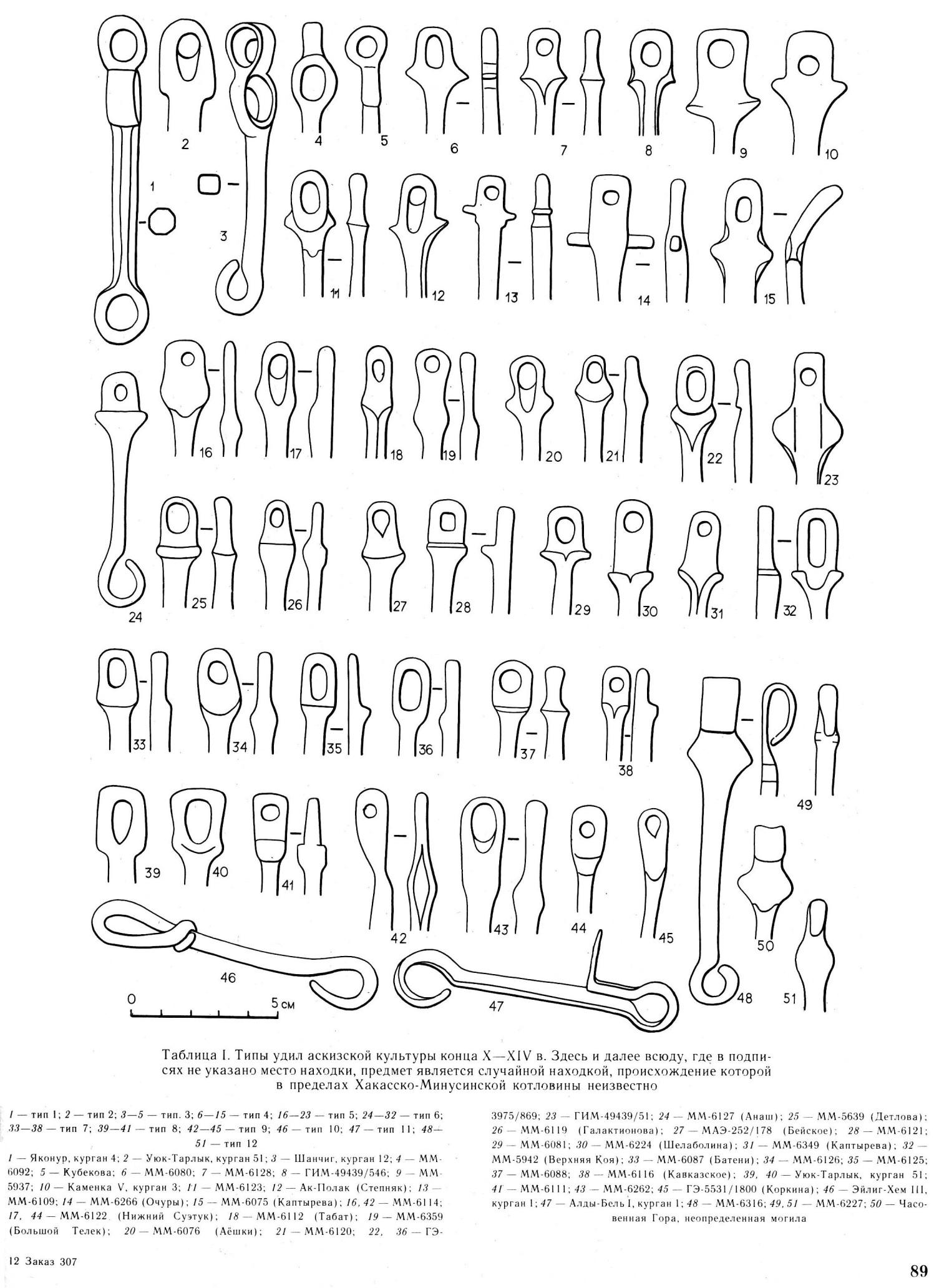 ^ Ñ. 89. Òàáëèöà I. Òèïû óäèë àñêèçñêîé êóëüòóðû êîíöà X-XIV â. Çäåñü è äàëåå âñþäó, ãäå â ïîäïèñÿõ íå óêàçàíî ìåñòî íàõîäêè, ïðåäìåò ÿâëÿåòñÿ ñëó÷àéíîé íàõîäêîé, ïðîèñõîæäåíèå êîòîðîé â ïðåäåëàõ Õàêàññêî-Ìèíóñèíñêîé êîòëîâèíû íåèçâåñòíî.
