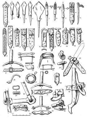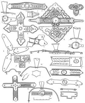 1-11, 13-15, 18-21, 24-27 — æåëåçî; 12 — øòàìïîâàííàÿ áðîíçà; 16-17 — áðîíçà ñ èíêðóñòàöèåé çîëîòîì (çàêë¸ïêè æåëåçíûå); 22, 23 — æåëåçî ñ àïïëèêàöèåé ñåðåáðîì.