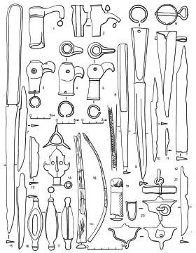 1, 6, 7, 9, 13 — èç ðàííåàñêèçñêèõ (ýéëèãõåìñêèõ) êóðãàíîâ; 3, 8, 10, 14 — ïðåäìåòû, ñîõðàíÿþùèå àðõàè÷íûå ÷åðòû îáëèêà; 2, 4, 5, 11, 12 — áðîíçîâûå ïðÿæêè è áëÿøêè èç æåíñêèõ ïîãðåáåíèé; 15-54 — ôîðìû çàâåðøåíèé íàêîíå÷íèêîâ ìàëèíîâñêîãî ýòàïà; 55-79 — ôîðìû çàâåðøåíèé íàêîíå÷íèêîâ êàìåíñêîãî ýòàïà.