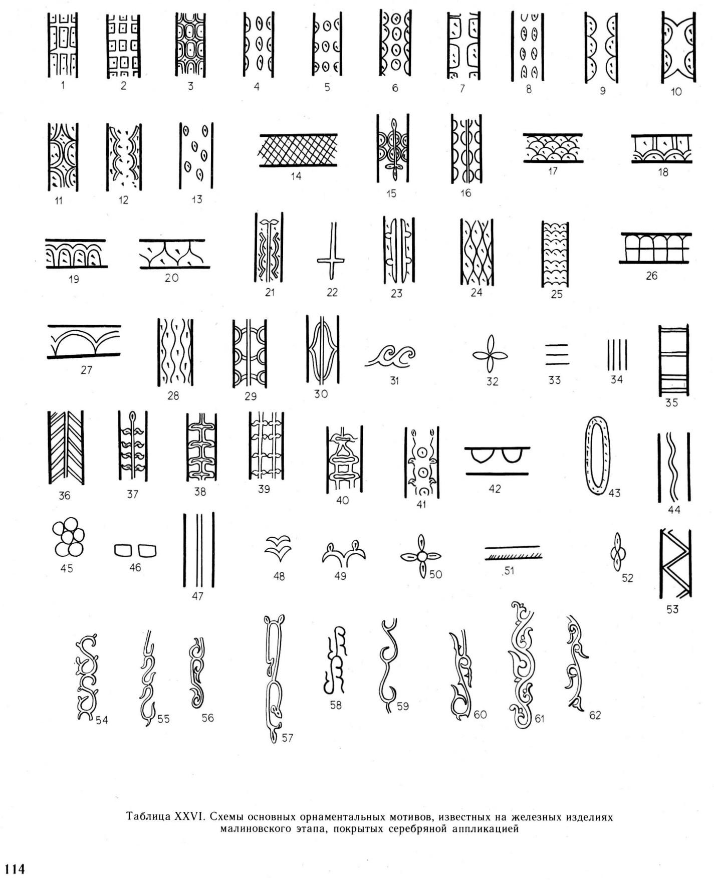 ^ Ñ. 114. Òàáëèöà XXVI. Ñõåìû îñíîâíûõ îðíàìåíòàëüíûõ ìîòèâîâ, èçâåñòíûõ íà æåëåçíûõ èçäåëèÿõ ìàëèíîâñêîãî ýòàïà, ïîêðûòûõ ñåðåáðÿíîé àïïëèêàöèåé.