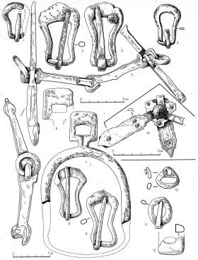 ^ Ñ. 102. Òàáëèöà XIV. Áëÿøêè ñ êîëüöàìè è ïîäâåñíûå íàêîíå÷íèêè (1-18); ïðÿæêè-ïåòëè (19-29); áëÿõè-ëóííèöû (30, 31), ïðîðåçíûå áëÿõè (32, 33), ñåäåëüíûå áëÿõè è ïðîáîè (34-39), ñåäåëüíûå íàêëàäêè (40-44). Ìàëèíîâñêèé è êàìåíñêèé ýòàïû.