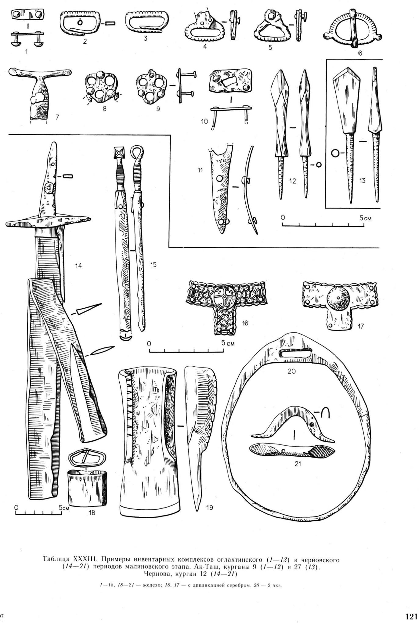 ^ Ñ. 121. Òàáëèöà XXXIII. Ïðèìåðû èíâåíòàðíûõ êîìïëåêñîâ îãëàõòèíñêîãî (1-13) è ÷åðíîâñêîãî (14-21) ïåðèîäîâ ìàëèíîâñêîãî ýòàïà. Àê-Òàø, êóðãàíû 9 (1-12) è 27 (13). ×åðíîâà, êóðãàí 12 (14-21).