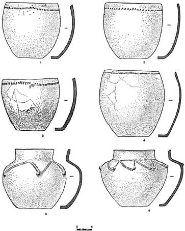 ^ Посуда, как уже говорилось, прежде всего подтверждает это положение. В сравнении с Уйбатским этапом, в погребениях переходного времени встречается ещё меньшее количество типов глиняных сосудов (см. табл. II). Их всего 9. Остаются пережившие всю эпоху типы: кубковидный (2), бомбовидный (7) (рис. 57—5, 6 и 58—6), баночный I (8), баночный II (9) (рис. 57—1-4, 58—2-4, 59—1-4 и 6), кувшины (10) (рис. 58—1 и 5), бочонковидный I (13) (рис. 59—5), подвесной I (22) (рис. 60—2), подвесной II (23) (рис. 60—1) и горшковидный II (12) (рис. 60—3).